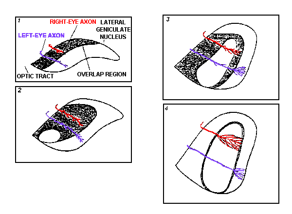 Axonal remodelling in the lateral geniculate nucleus occurs largely before birth. As shown in this figure, at the earliest times in development (1), the axons from the left eye and right eye are simple and tipped with growth cones. The shaded region represents the intermixing of inputs from both eyes. After further development (2), the axons grow many side branches. The axons soon begin to lose some side branches and start to extend elaborate terminal branches (3). Eventually these branches occupy the appropriate territory to form eye-specific layers (4).